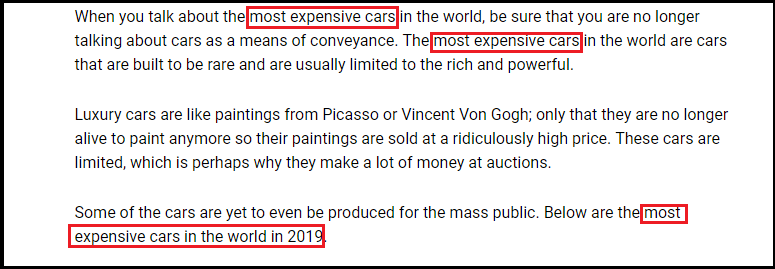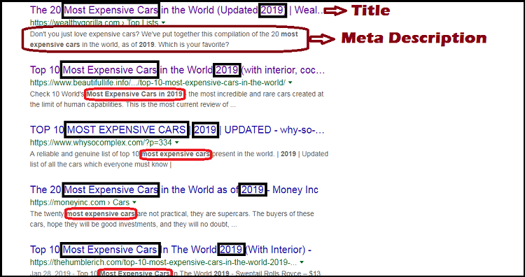 Next on, Google spiders believe that the content of the web pages will provide the answer to people that search for “most expensive cars in 2019”.