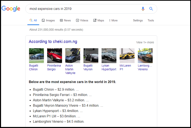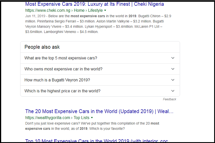 For example, when I searched for “most expensive cars in 2019”, I get the result below: