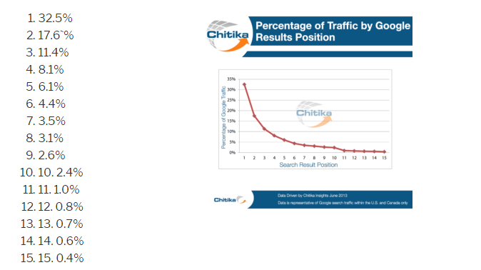 Most of the traffic goes to the page in Position 1, while result in Position 2 is found to receive about HALF of clicks that goes to the 1st position.